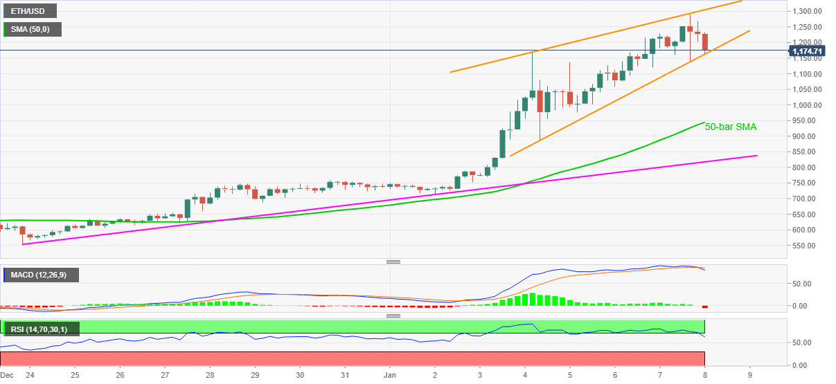 ETH/USD portrays a bearish chart pattern, rising wedge, following its pullback from the highest since January 2018. The quote recently bounces off an intraday low of $1,160 but remains pressured with over 3.0% losses since the start.