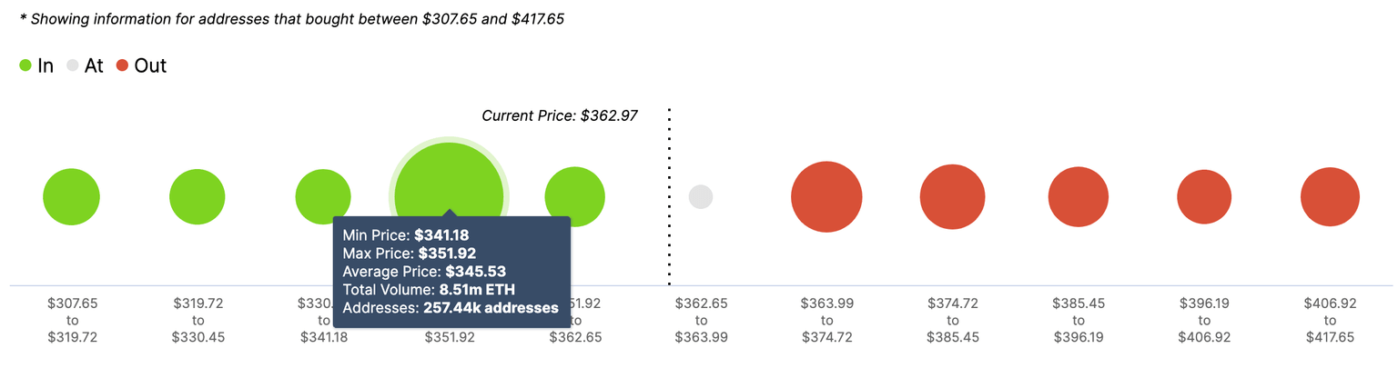 Moreover, In/Out of the Money data shows that the price passed a stiff resistance at $340-$350, and over 257k addresses holding over 8.5 million ETH moved into a green zone. Now that this barrier has turned into a support, the price can recover to $380 with the supply wall of over 2.8 million ETH. Once this barrier is out of the way, the upside momentum will gain traction and push the price towards the next local resistance of $400-$407 with another 3.85 million coins waiting for their breakeven point.