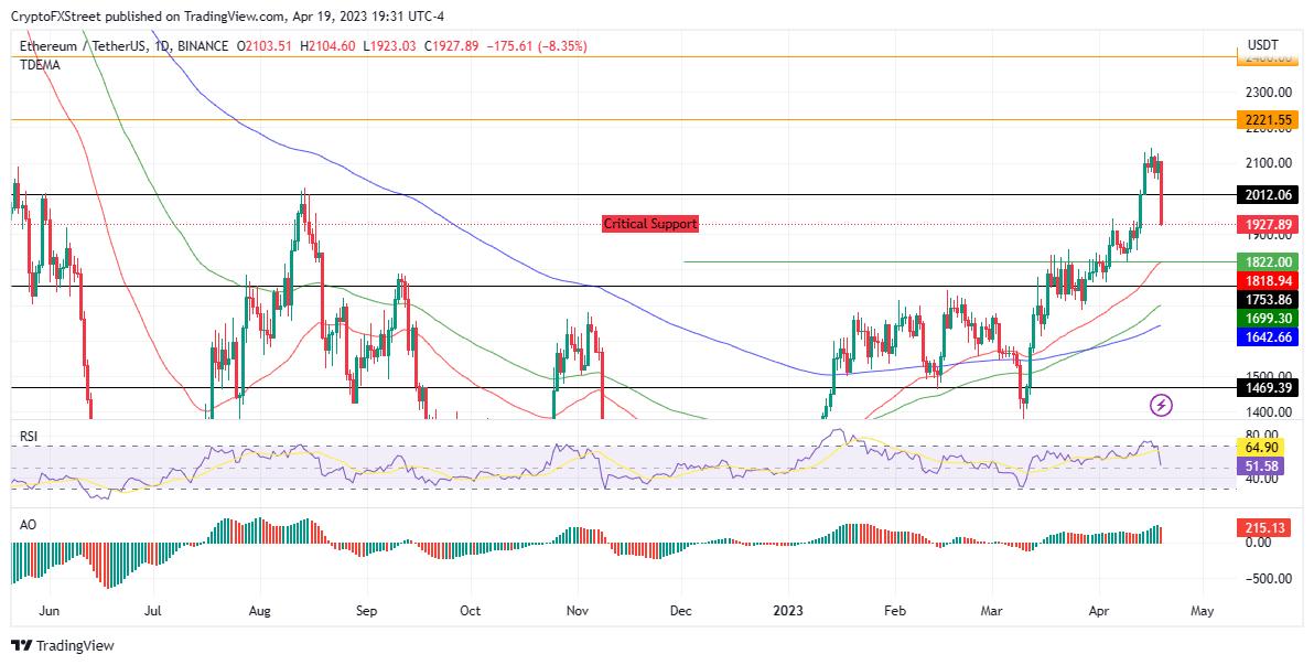 On April 19, ETH broke out of the price range sustained for five consecutive days, dropping around 6% as bulls engaged a load-shedding gear. While the sell-off has taken Ethereum price back below the $2,000 level, the largest altcoin remains bullish. In fact, it could be coiling up for a major breakout as it tests the major support at $1,822.