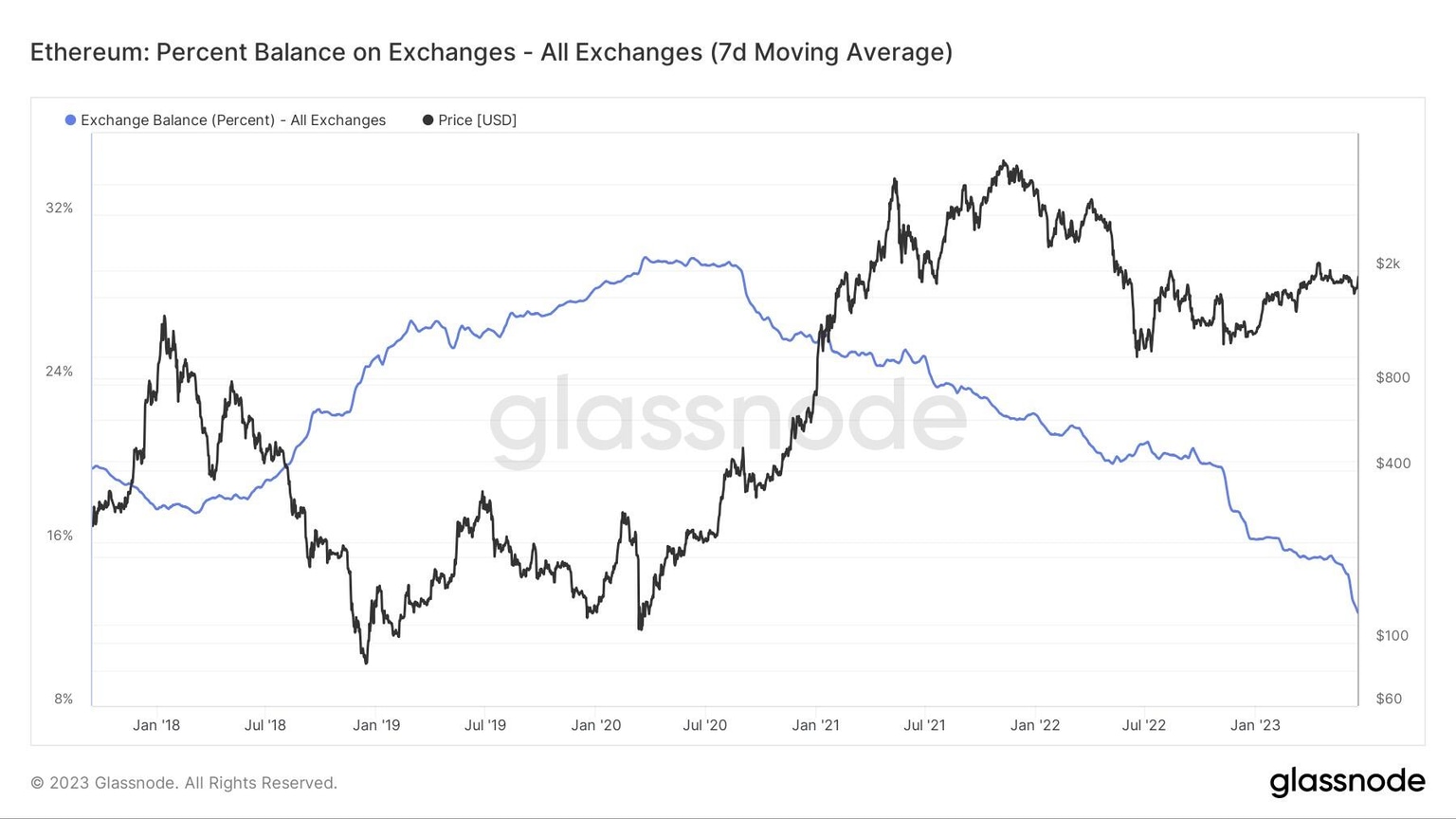 Percentage of ETH’s supply on crypto exchanges. Source: Glassnode