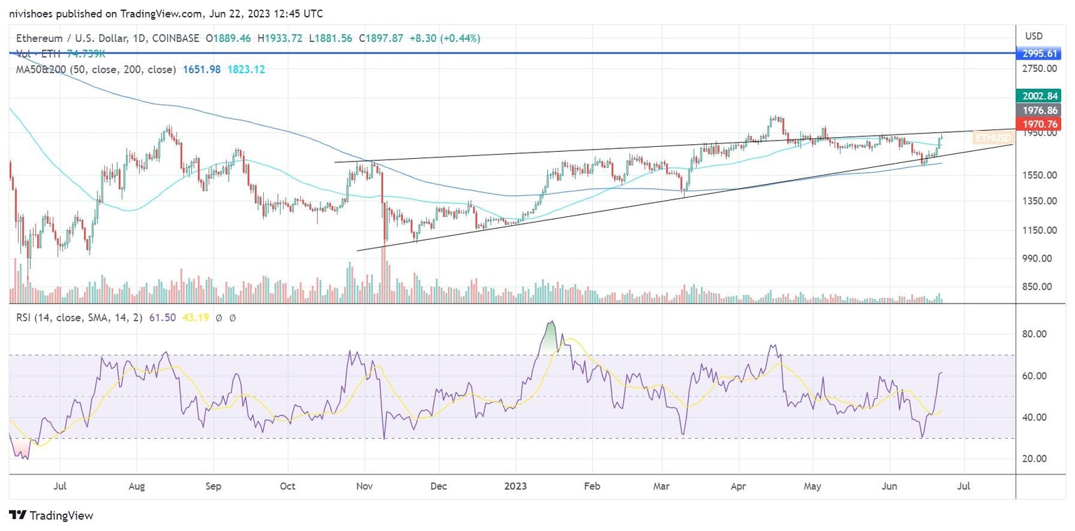 The ETH/USD pair is currently facing resistance around the horizontal level of $1,906. The pair has recorded higher lows since November 2022, with the $1,900-$2,000 level acting as technical and psychological resistance levels, according to the ascending triangle pattern.