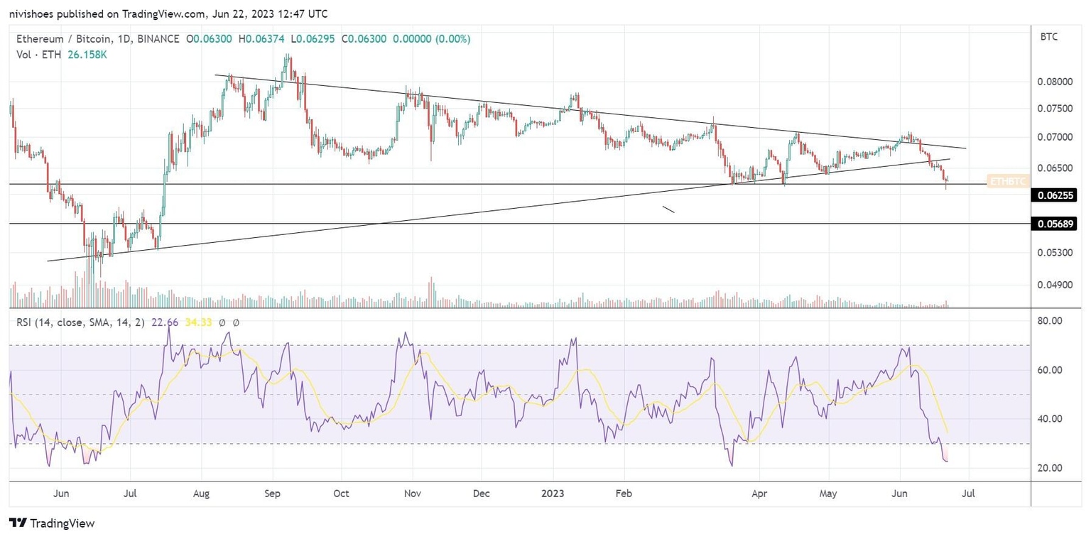 The ETH/BTC pair is looking to establish support around the 2023 lows of 0.06255 in Bitcoin terms. If sellers push the price below this level, bearish targets of 0.05689 BTC would get exposed.