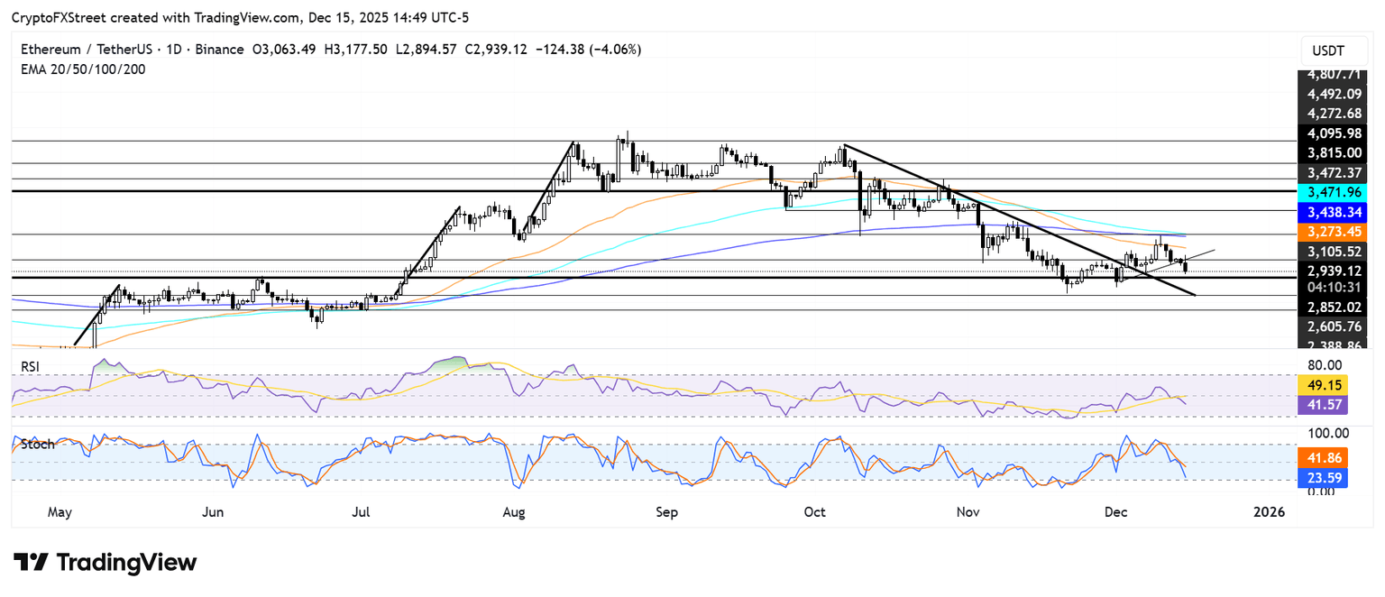 Ethereum Price Forecast: ETH eyes support at $2,850 following 5% plunge