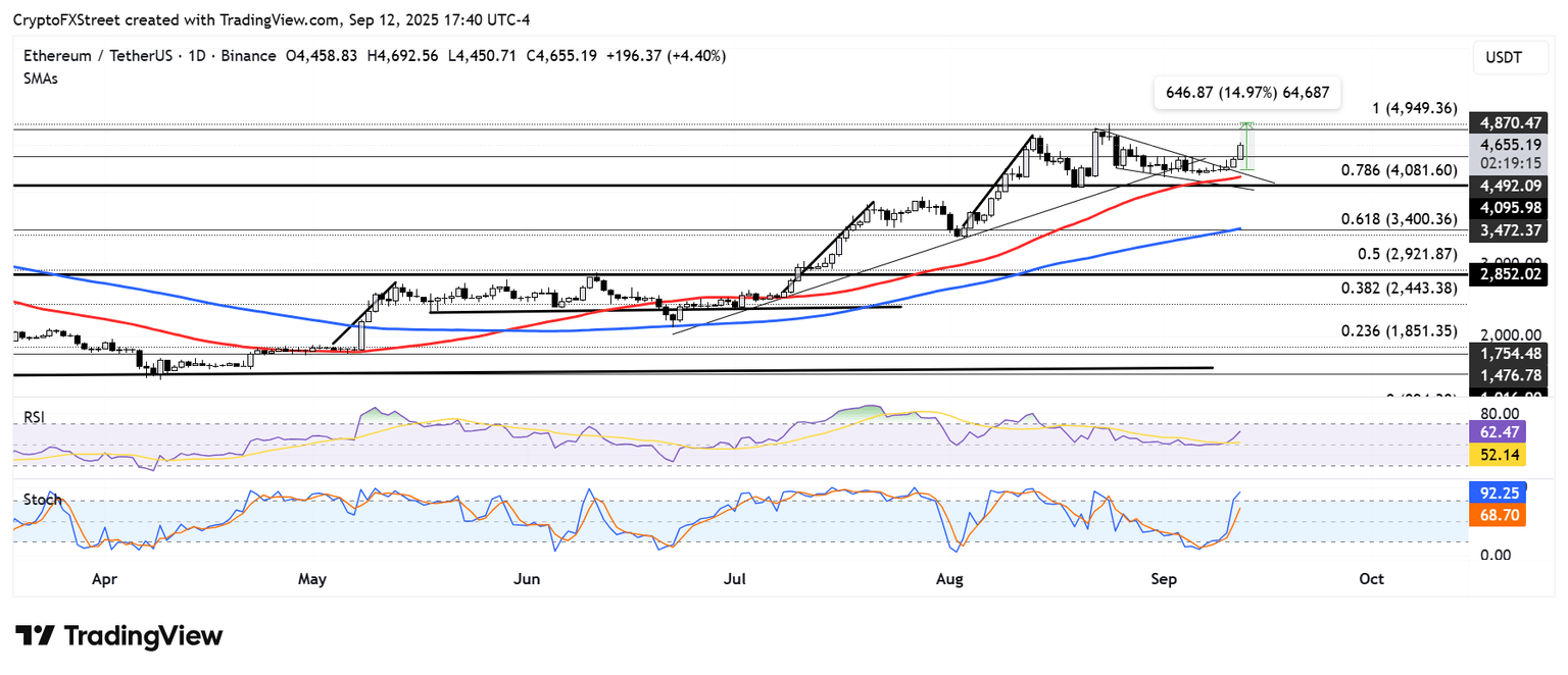 - ETH has broken above the $4,500 key resistance and is now eyeing a move toward its all-time high.