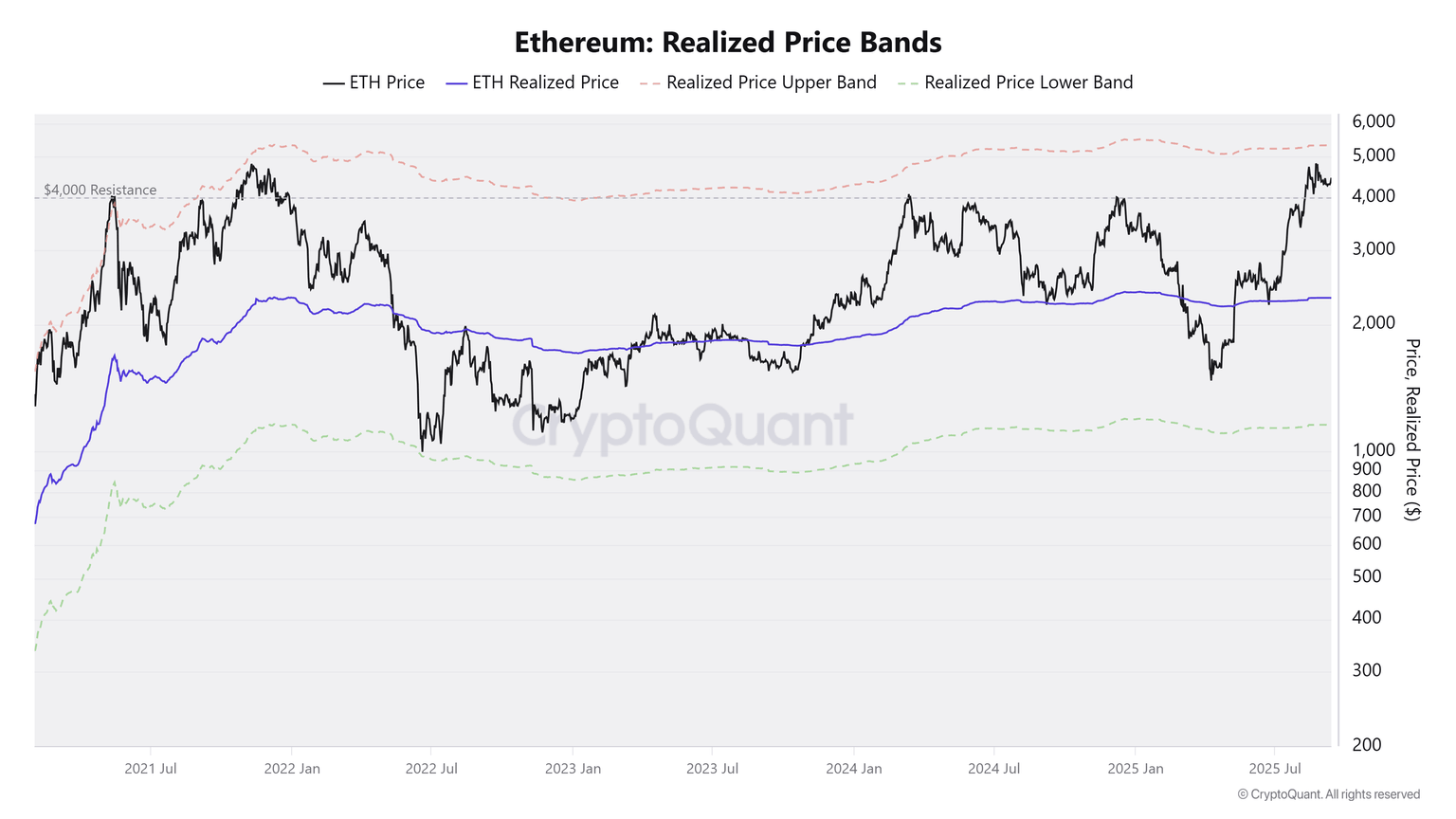 However, the analysts also highlighted a strong resistance or selling pressure around Ethereum's Realized Price Upper Band at $5,200. This follows ETH's correction near the upper band after hitting a new all-time high of $4,956 on August 24.