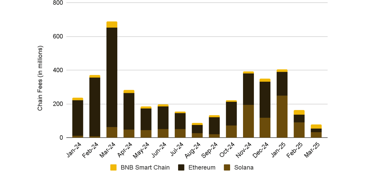 - Ethereum is losing ground to Solana and BNB Chain in terms of fees captured since it introduced blobs.