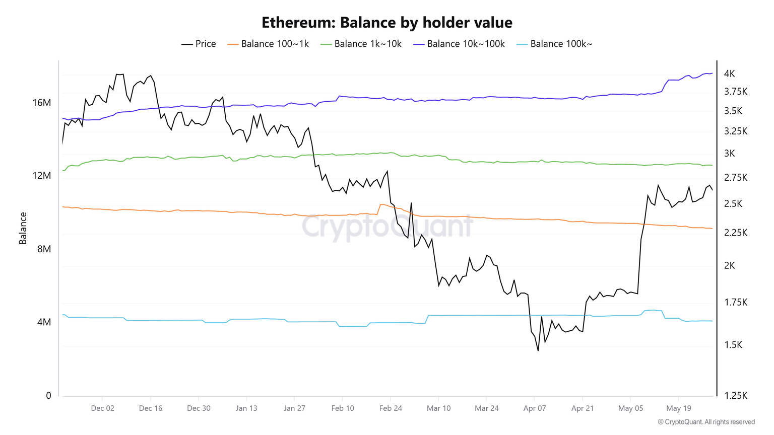 The positive macroeconomic signs triggered bullish sentiment among Ethereum whales, as addresses holding between 10K - 100K ETH grew their holdings from 16.50 million ETH to 17.62 million ETH in May — a 1.12 million ETH increase, representing ETH's largest monthly whale buying pressure since July 2022.