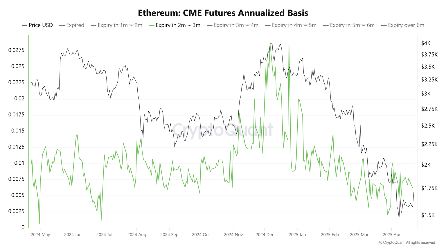 - Ethereum CME basis has dropped from 20% in November 2024 to around 5% in April 2025.