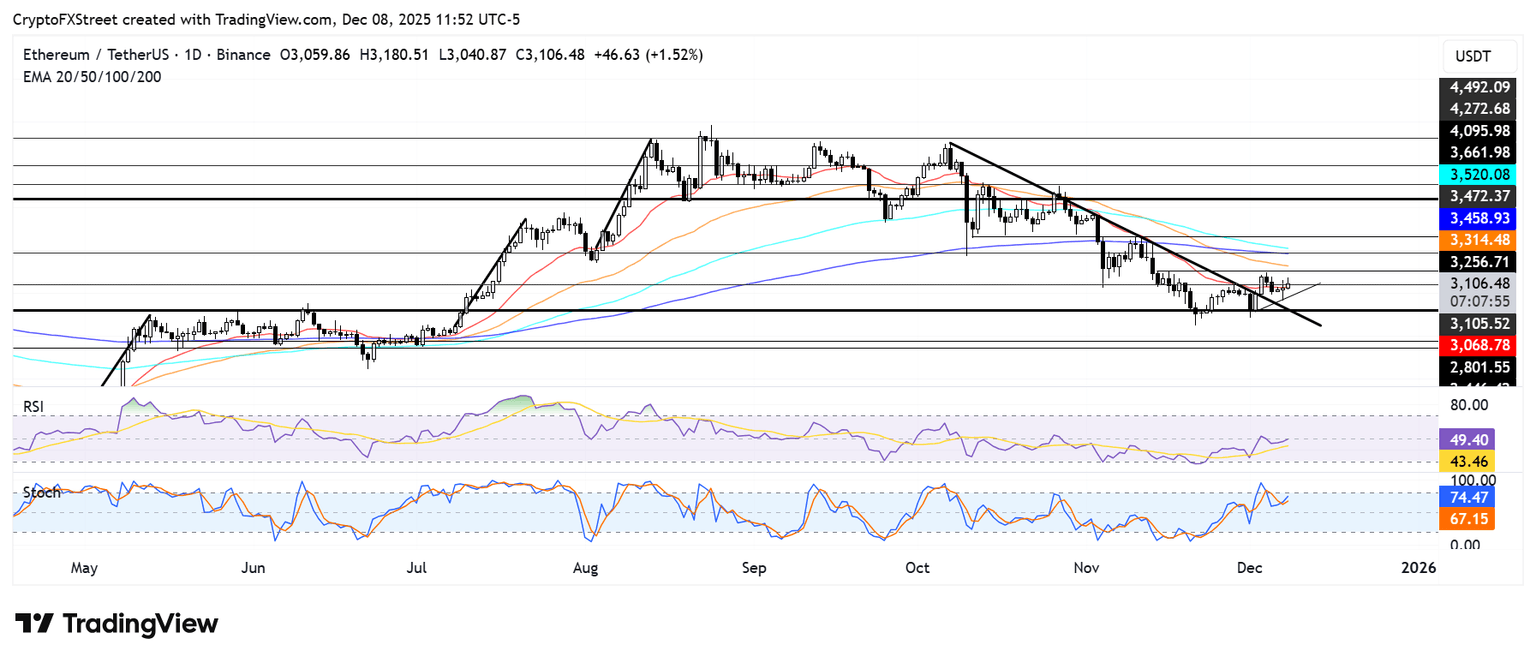 Ethereum Price Forecast: ETH recovers $3,100 as BitMine, top whales expand buying pressure