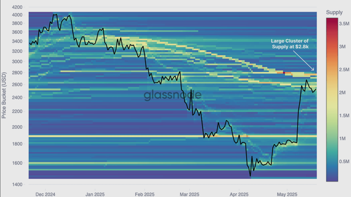 "There is a significant concentration of investor cost basis levels around the $2,800 level," Glassnode analysts wrote in a report on Tuesday. "This region is likely to attract increased sell-side pressure, as many investors who were previously underwater may look to de-risk at, or near their break even level, and take some chips off the table."