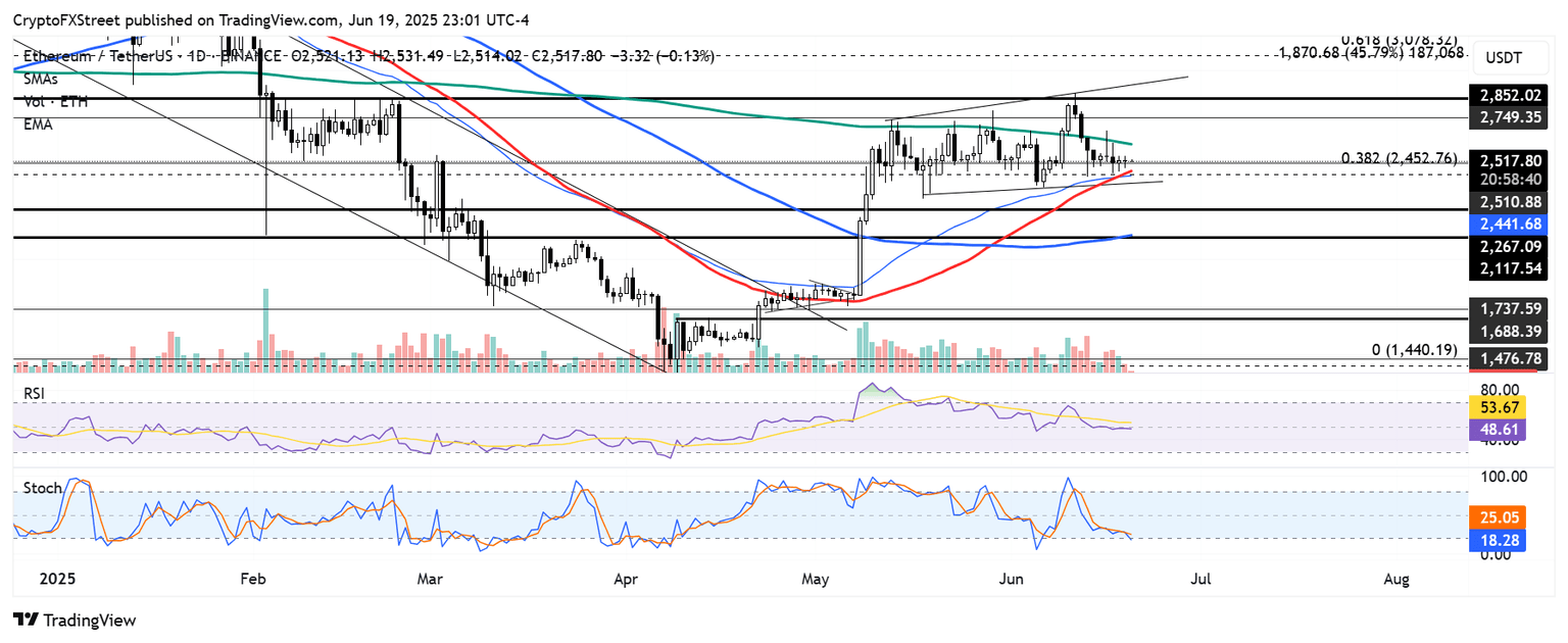 With the 200-day Simple Moving Average (SMA) proving difficult to overcome, ETH continued holding the $2,450 support at the 38.2% Fibonacci Retracement. The level is strengthened by the convergence of the 50-day SMA and Exponential Moving Average (EMA) just above the lower boundary of a key channel.