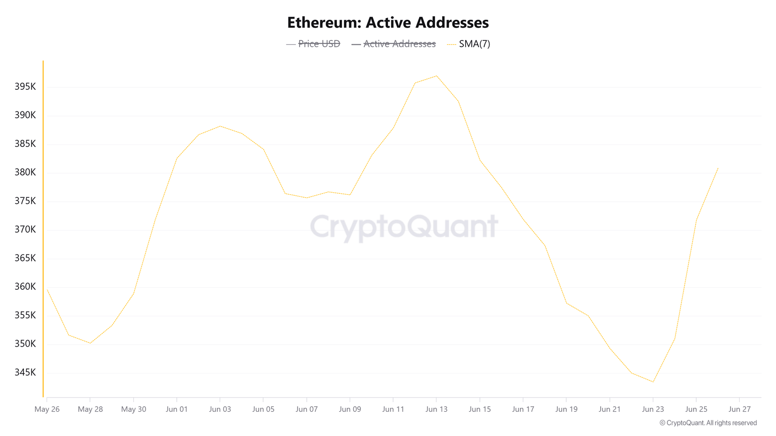 Ethereum's active addresses have been growing again, breaking its downtrend that began on June 13, despite prices remaining largely horizontal.