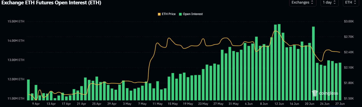 The derivatives market paints a similar picture, with open interest (OI) failing to surpass the 13 million ETH mark since it declined on Saturday. Open interest refers to the total value of outstanding or unsettled contracts in a derivatives market.
