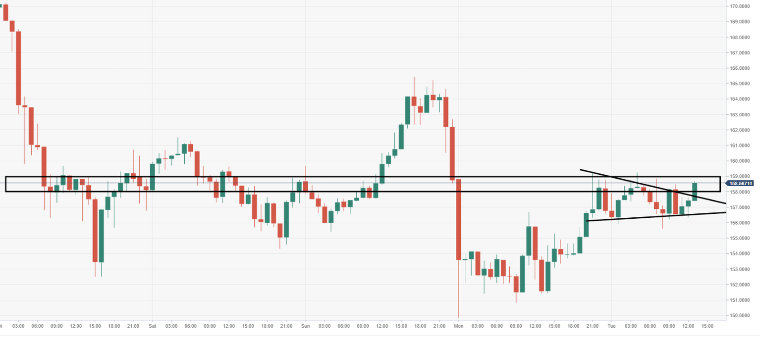 The price movements via the 60-minute chart view remain very much directionless, with supply observed from $157-159. There is the possibility of a bullish pennant breakout.
