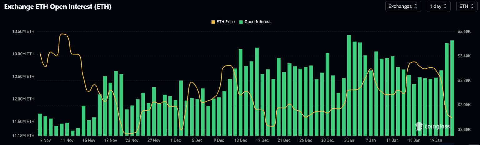 Despite the price decline, Ethereum's open interest (OI) jumped from 12.64M ETH to 13.30M ETH over the past 24 hours.