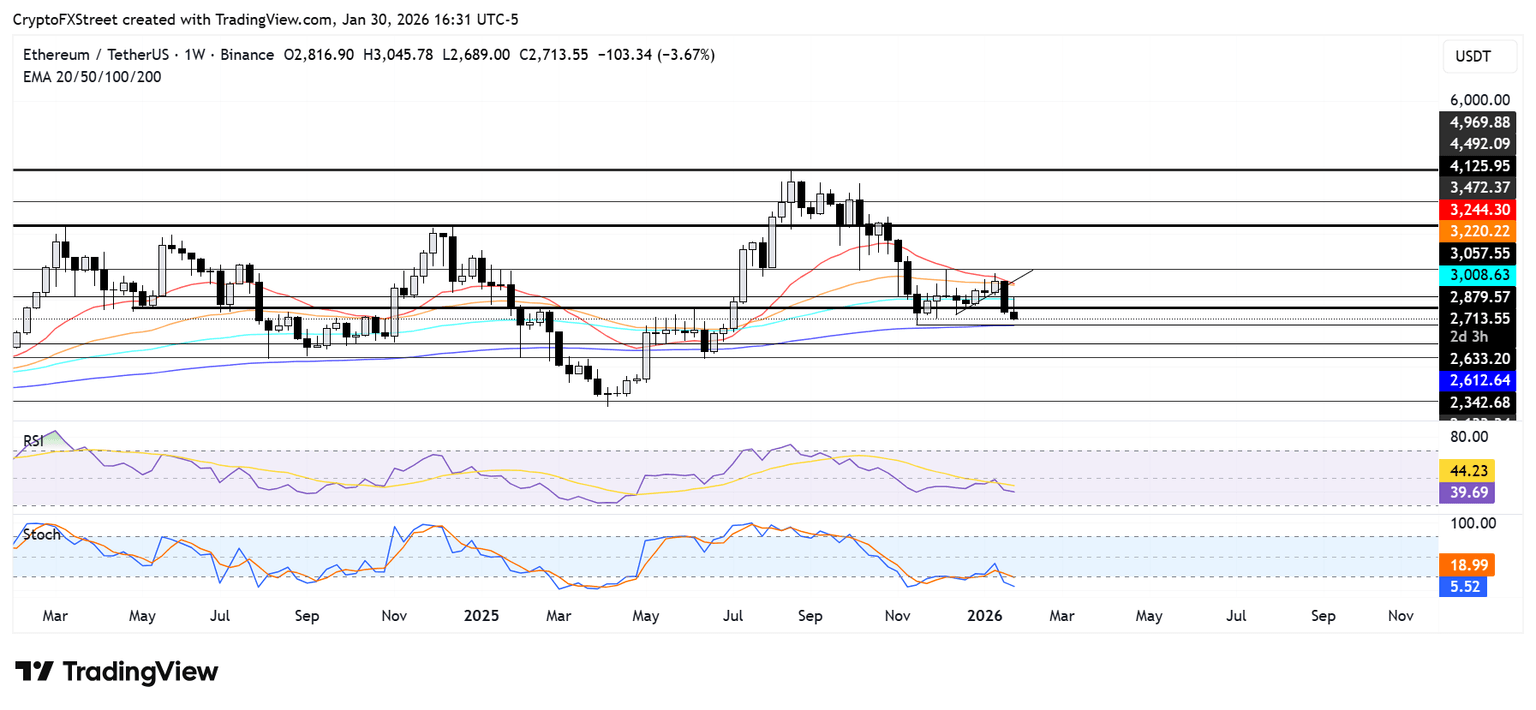 ETH is approaching the $2,630 support level after seeing a rejection at the $3,060 resistance near the 100-week Exponential Moving Average (EMA). The $2,630 support level is strengthened by the 200-week EMA, which bulls defended in June and November last year.