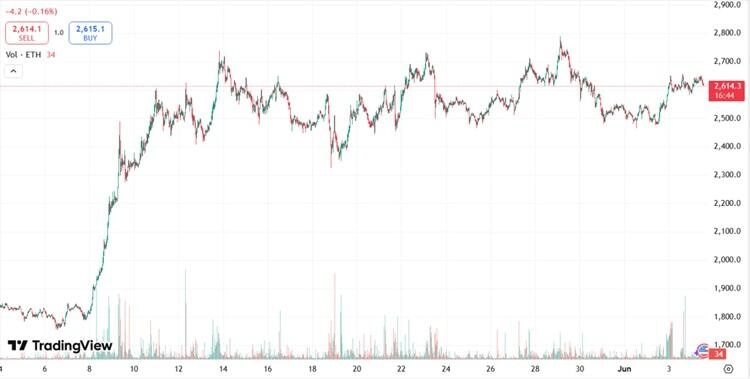 As of June 4, 2025, Ethereum is trading at approximately $2,627, maintaining a strong support level above $2,500. Analysts suggest that if ETH can break through the resistance range of $2,925, it may target higher levels around $3,150 to $3,500 in the near term.