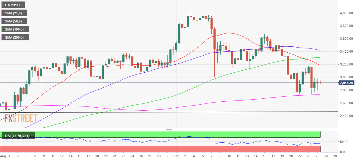 At the press time, ETH/USD is trading almost unchanged on the day around $2900, having bounced off from daily lows at $2800.