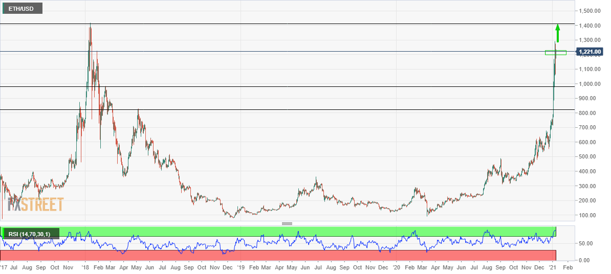 As observed in the daily chart, Ethereum has additional room to the upside, with eyes set on the January 14 2018 high at $1419.