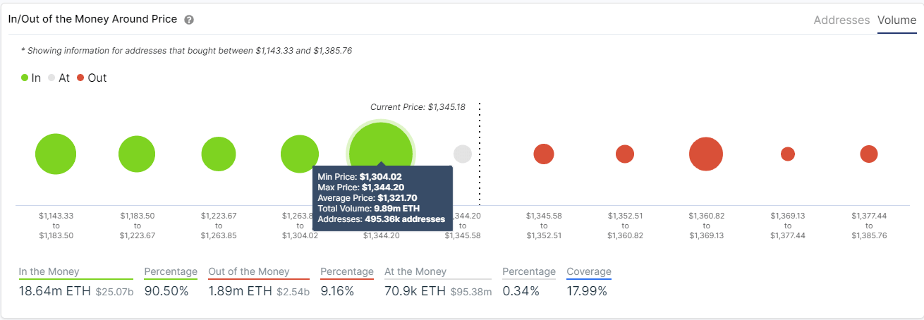Punctuating the significance of $1,300 support, IntoTheBlock's In/Out of the Money Around Price (IOMAP) chart shows that nearly 10 million ETH had been bought by around 500K addresses at an average price of $1,320.