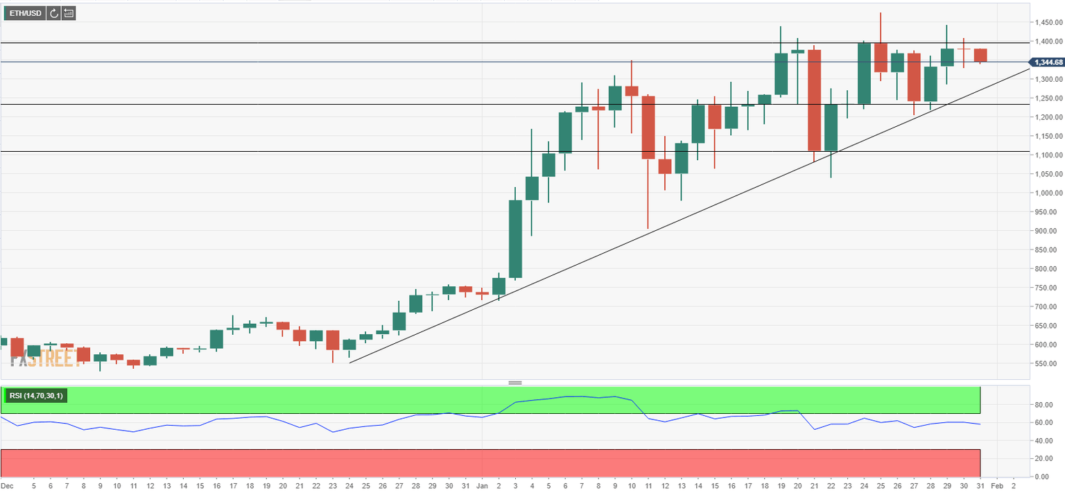 On the daily chart, the ascending trend line coming from late December remains intact and is currently located around $1,300. If ETH manages to hold above that line, it could renew all-time highs and target the next psychological level at $1,500. Moreover, an ascending triangle using the trend line and the static resistance at $1,400 seems to have formed on the same chart, confirming the view that a bullish breakout is likely.