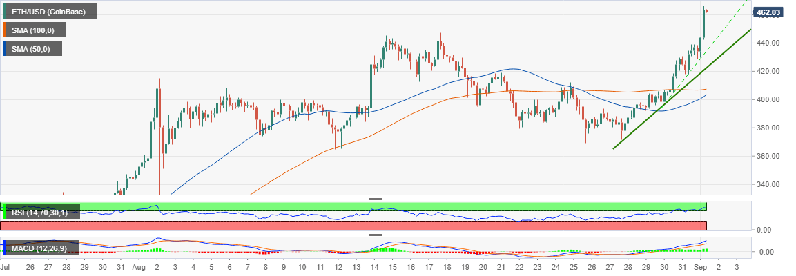 - Ethereum starts September in style rising above August high and trading a new yearly high at $466.