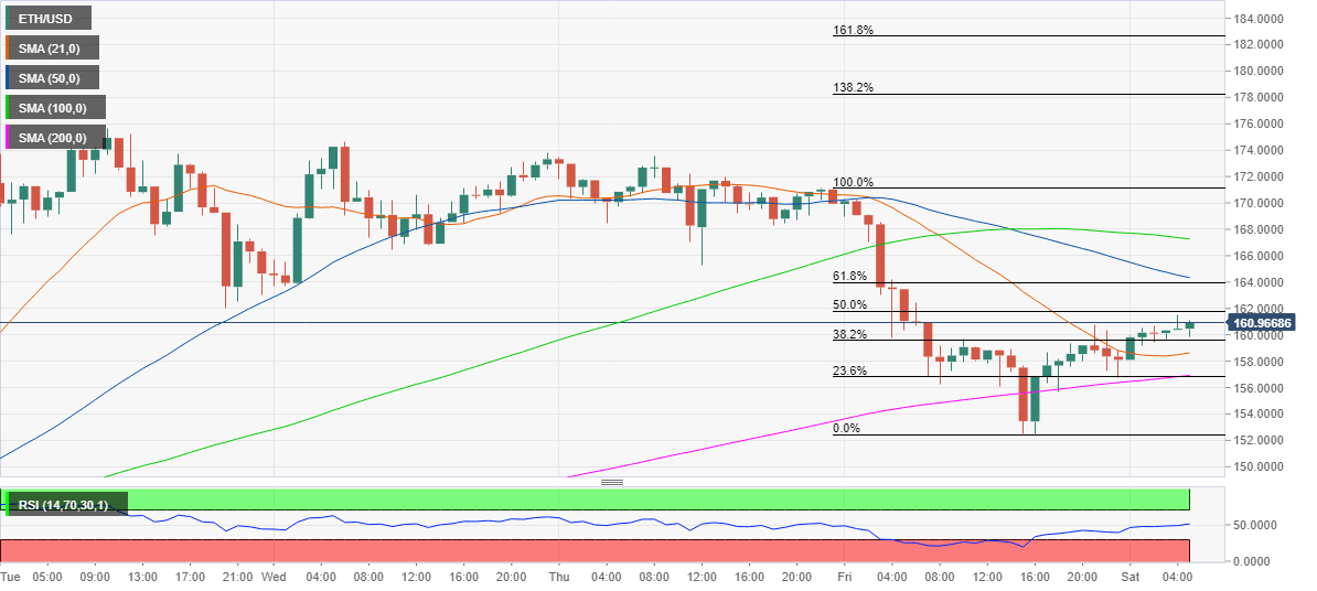 As observed in the hourly chart, the no. 2 coin has recovered half the Friday’s decline, with the bulls now facing exhaustion at the 50% Fibonacci Retracement of the slump. The buying interest will pick up pace should the price break through the latter. The next resistance is aligned around 164.00 levels, the intersection of the critical 61.8% Fib and the bearish 5-hourly Simple Moving Average (HMA). A reversal from Friday’s troughs will likely resume only on an hourly closing above the abovementioned supply area, opening doors for a test of the horizontal 100-HMA barrier at 167.27.