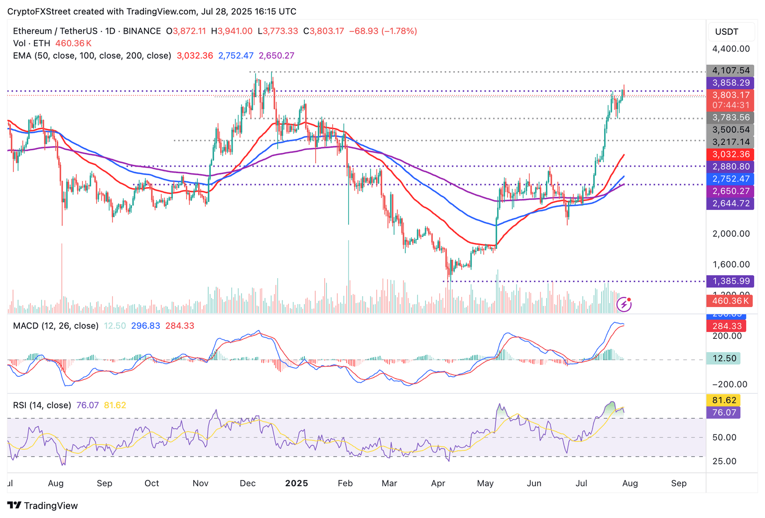 Ethereum (ETH) price is marginally trimming gains, trading at $3,803 on Monday. The leading smart contract token by market capitalization had extended the uptrend, reaching an intraday high of $3,941 before faltering to $3,773 (intraday low).