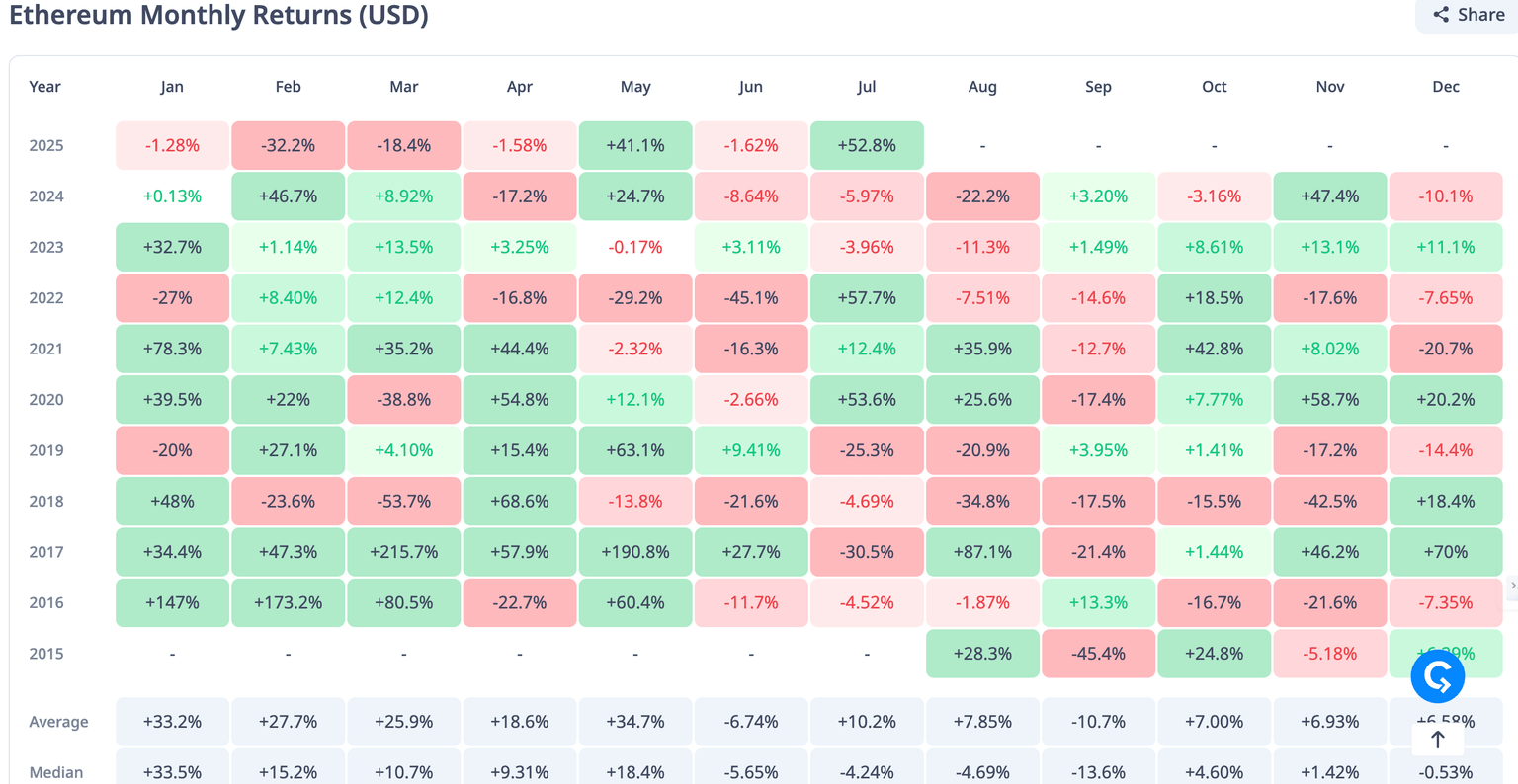 According to CryptoQuant, ETH experienced a 41.1% surge in May, with the rest of the months averaging losses, as shown on the chart below.