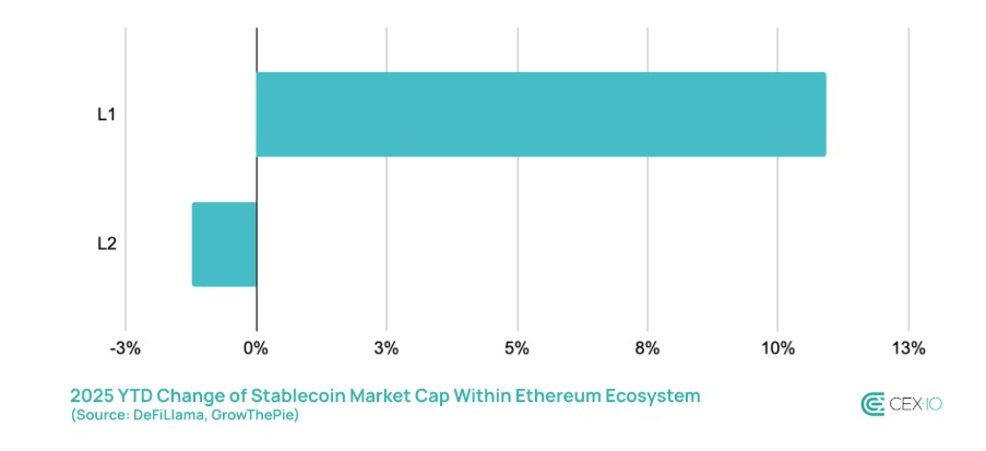 Because of this, the mainnet’s stablecoin market capitalization grew by 11% in 2025, taking market share away from its layer-2s. While the mainnet recouped stablecoin market share, the combined stablecoin market on L2s only shrank by 1%.