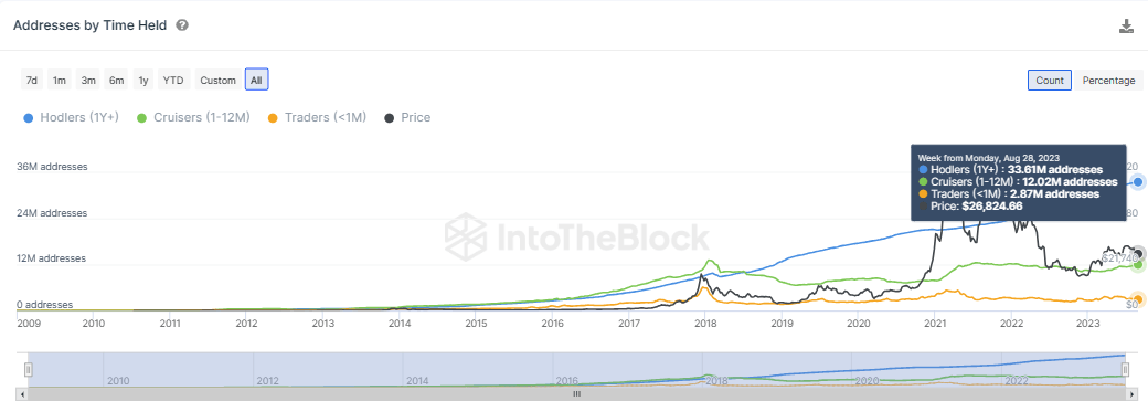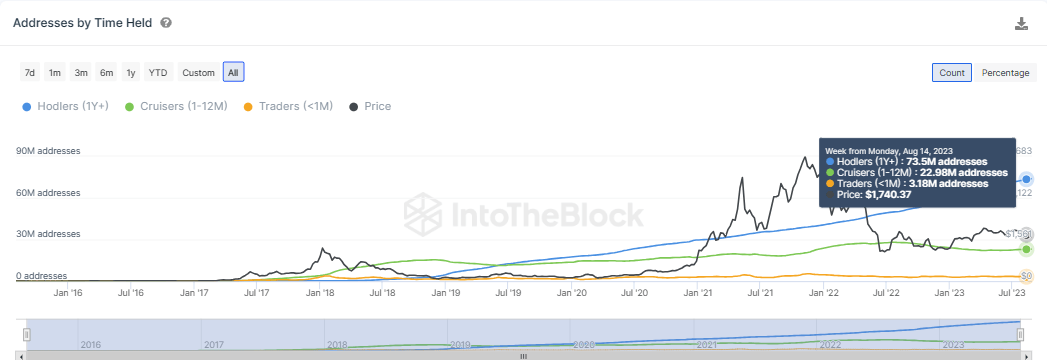 On-chain data from IntoTheBlock shows a commendable rise in long-term holders over the last year, with Ethereum outperforming Bitcoin. Specifically, Ethereum boasts a stark 73.5 million long-term holders (those who have held the cryptocurrency for more than one year) vs Bitcoin’s 33.61 million.