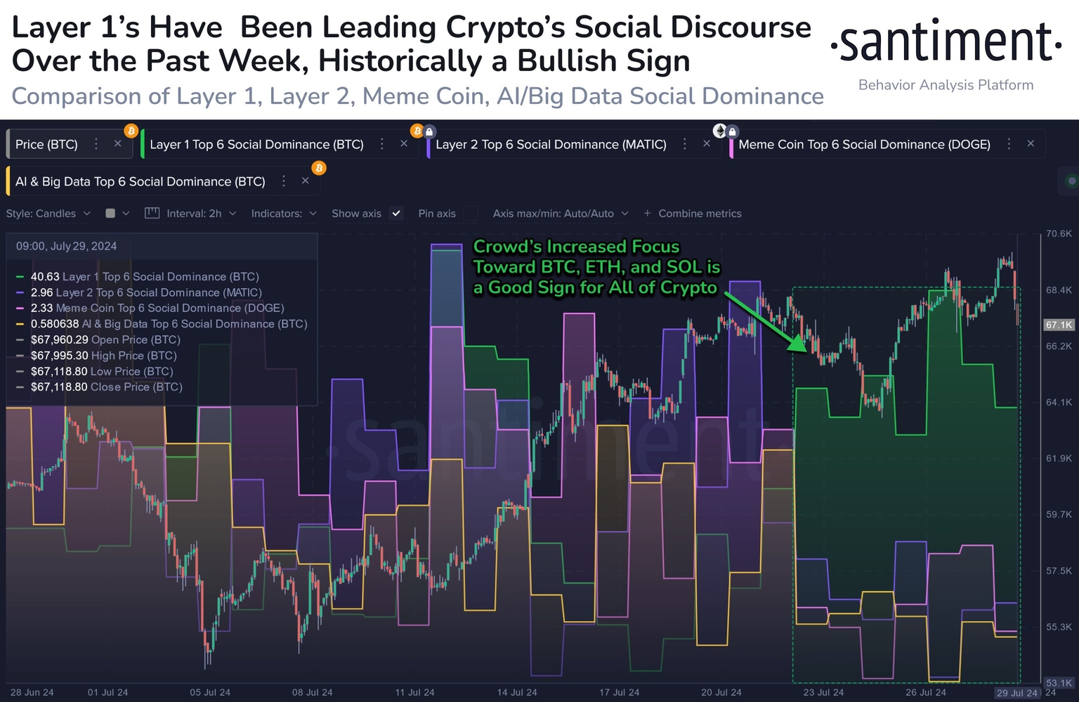 - Santiment social data shows that investors have shifted their attention from meme coins and low-cap tokens towards major Layer 1s like Ethereum, Bitcoin and Solana. The market has historically shown strength and occasionally rallied when investors focus more on large-cap tokens.