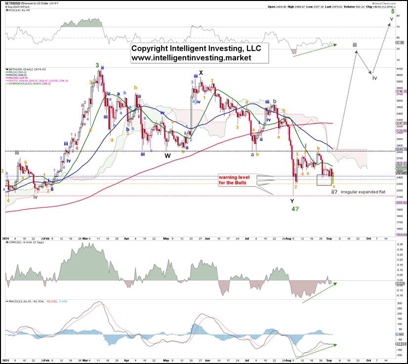 Thus far, the August 5 low has held, and as long as it does, we can allow for the (grey) wave-i, ii setup, as shown, to develop further. In this case, grey W-i was a leading diagonal, and grey W-ii was an irregular expanded flat. Note that at today’s low, almost 76.40% of the potential W-i rally was retraced, a typical level for a 2nd wave. Moreover, the technical indicators (TIs, such as the RSI14, MF14, and MACD) are starting to creep up, which is a positive development. However, ETHUSD is still well below its declining Ichimoku Cloud, 20-day simple moving average (d SMA), and below the declining 50d and 200d SMA. Thus, the chart trend is still 100% Bearish, and the Bulls have a lot of work left to do. First, a break back above the late-August high, labeled as orange W-b, at $2813, is required to help tell us the grey W-iii is underway. That level is critical support/resistance.