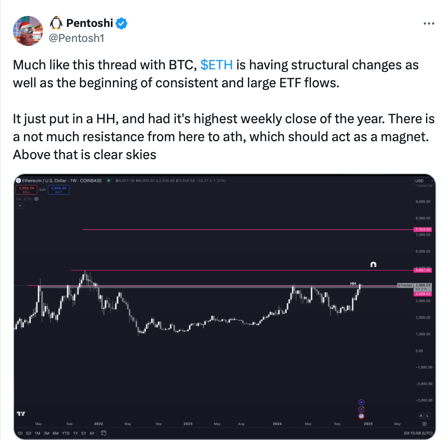 Pentoshi highlighted that Ether had its “highest weekly close of the year” and echoed Adams’ sentiment, suggesting a retest of its all-time high could happen sooner than many traders anticipate.