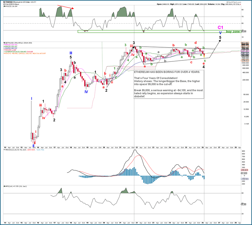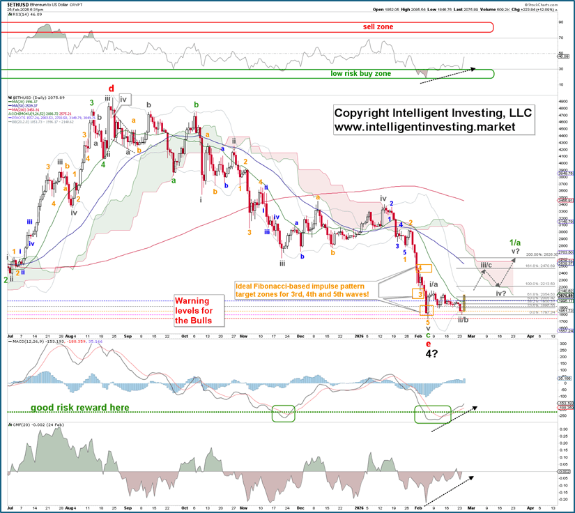 Meanwhile, the short-term price action and associated EW analyses show that we can count Ethereum’s decline from its August 2025 high as a complete (green) a-b-c, subdivided into a (gray) abc-abc-i, ii, iii, iv, v decline. See Figure 2 below. Besides, its daily RSI14 recently dipped into the “low risk buy zone,” as did the aforementioned monthly RSI5, while exhibiting positive divergence (black dotted arrow). Also, the MACD and Money Flow exhibit such divergence.
