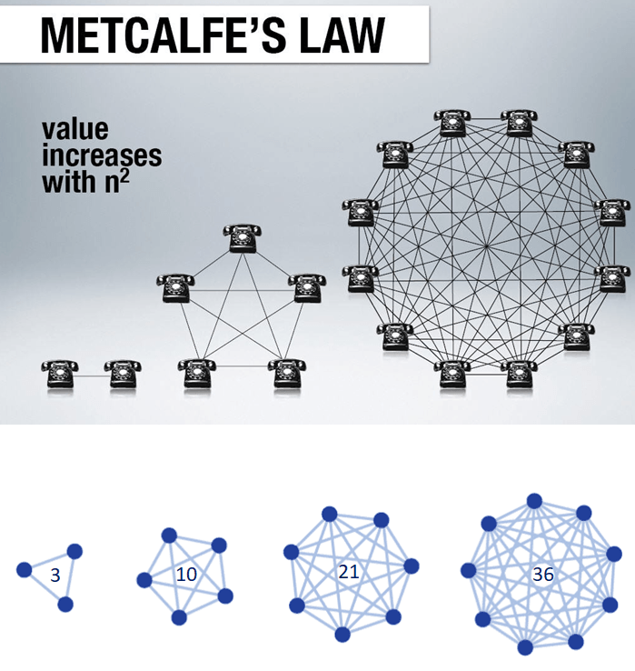 According to the diagram above, if we have three telephones (apps) on the network, then three connections can be made. However, the remarkable thing is that if there are five telephones, then ten connections can be made, while if there are seven telephones in the network, then we have twenty-one connections, and with nine telephones, thirty-six connections. In other words, increasing the number of phones (apps) works exponentially on these connections. The more people using the network, the more users they will attract. The network is an ecosystem that can enjoy exponential growth when individuals use it according to Metcalfe's law. The more people are involved in an ecosystem, the more valuable it becomes.