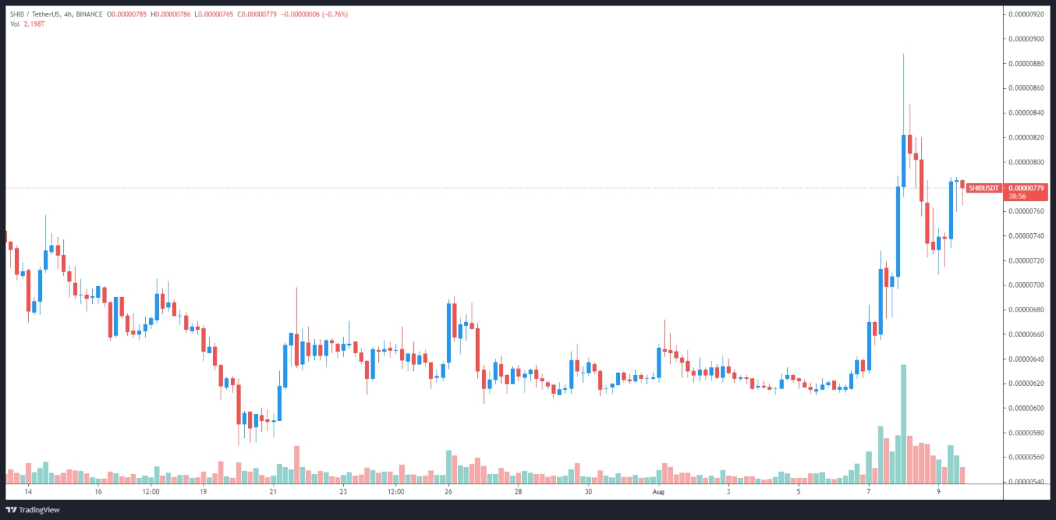 In the three weeks since its price bottomed, SHIB has seen a three-fold increase in its 24-hour trading volume which was followed by a 56% price rally to weekly high at $0.00000888 on Aug 8.