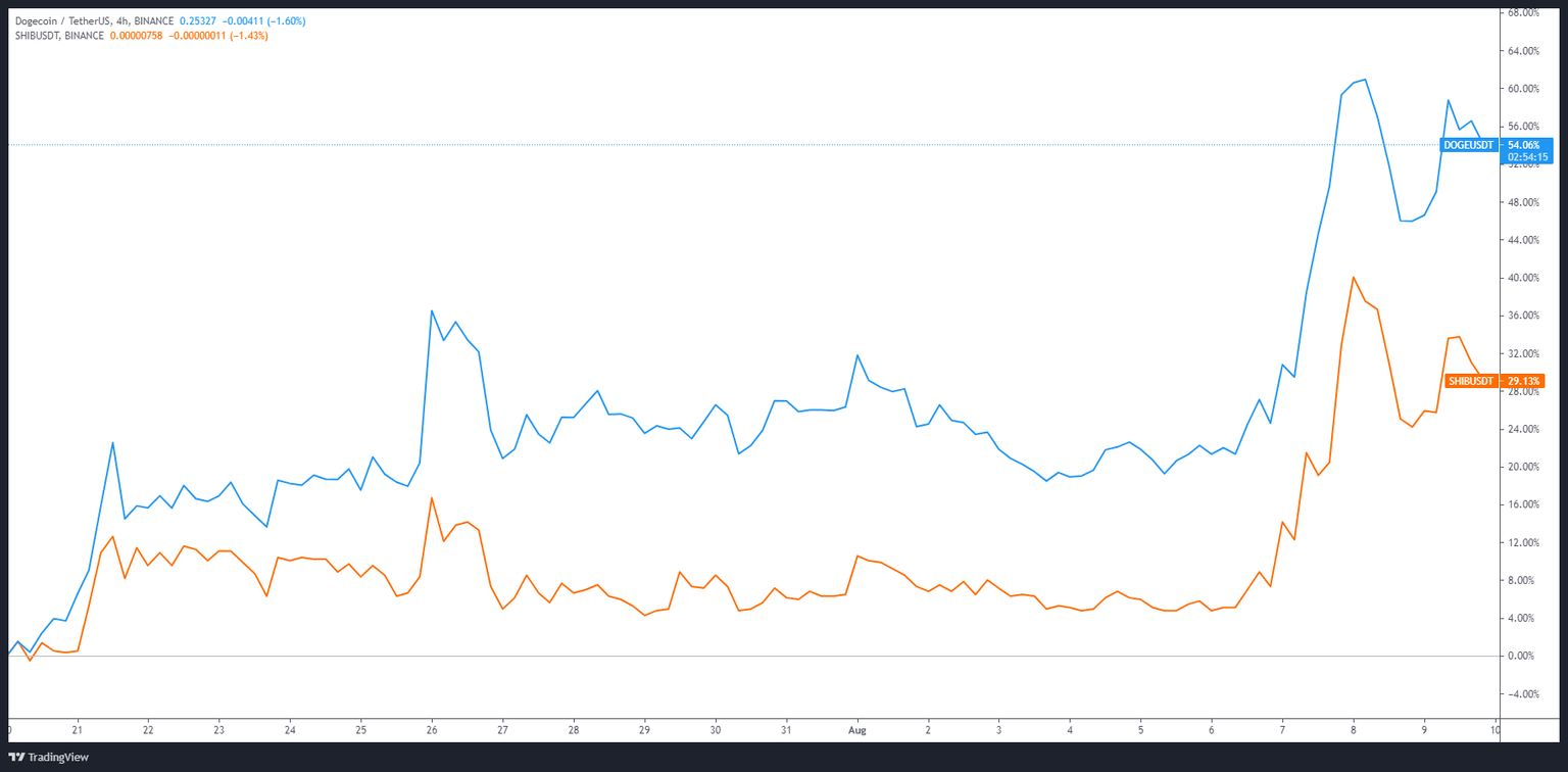 DOGE/USDT vs. SHIB/USDT 4-hour chart. Source: TradingView