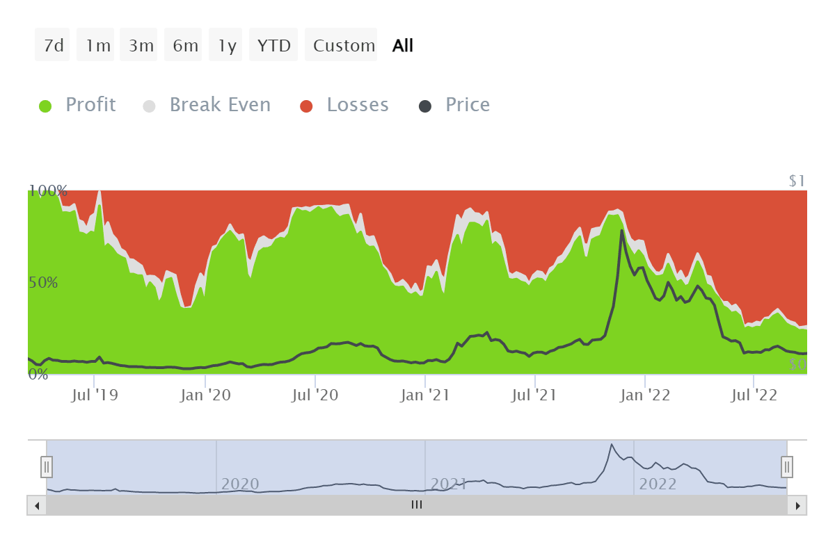 The consequences of the falling prices can be seen in CRO holders’ investments. Since CRO’s all-time high of $0.781, the total investors in profit have reduced from 81.39% to just 23.36%. At the time of writing, over 198k addresses, which amount to 74% of all investors, are suffering losses.