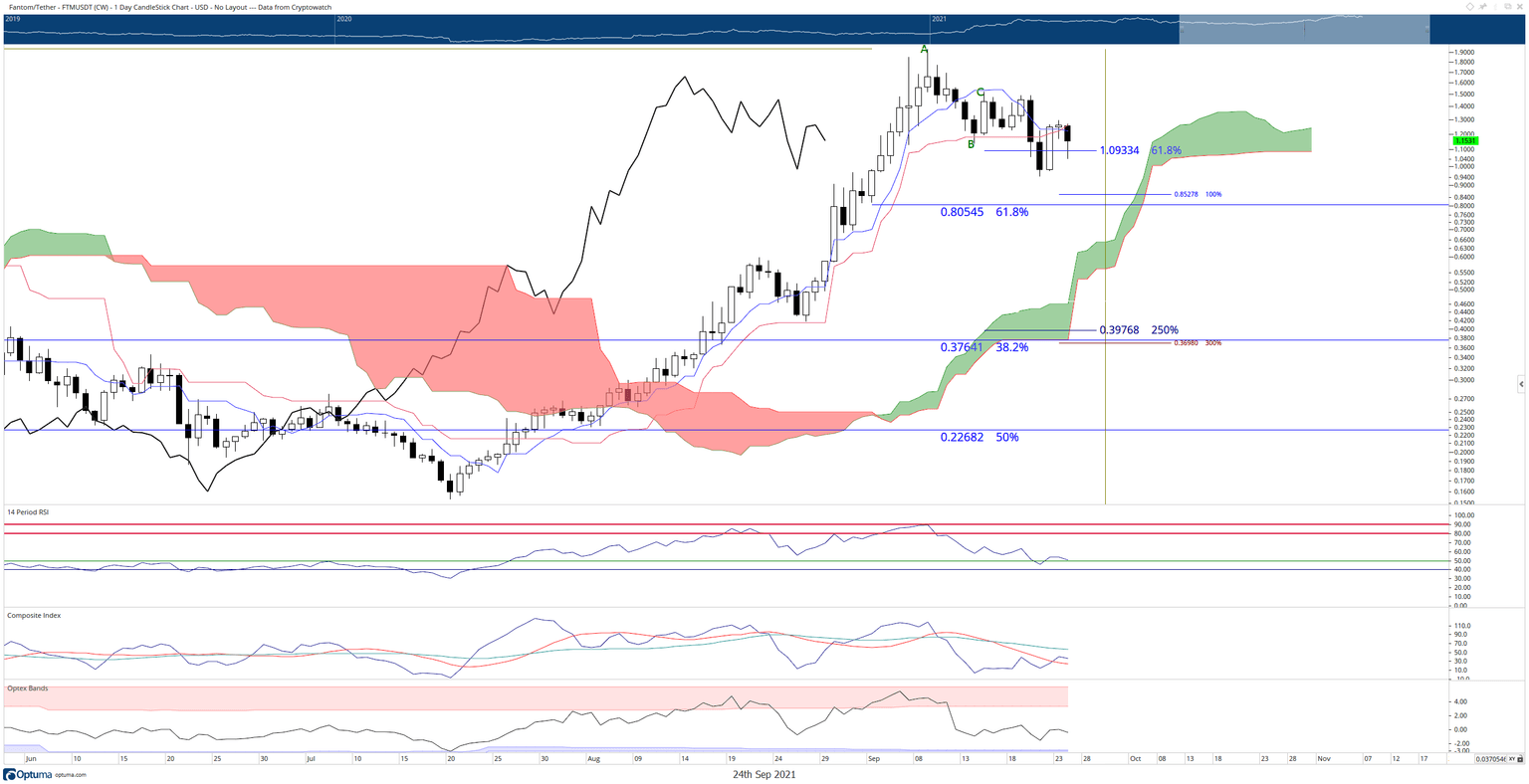 Fantom price is nearing a make-or-break level for both sides of the market. Control remains with the sellers, even though Fantom price has rallied as much as +33% from the Tuesday lows. It remains below the Tenkan-Sen and Kijun-Sen ($1.25) – levels that buyers must close above to take over.