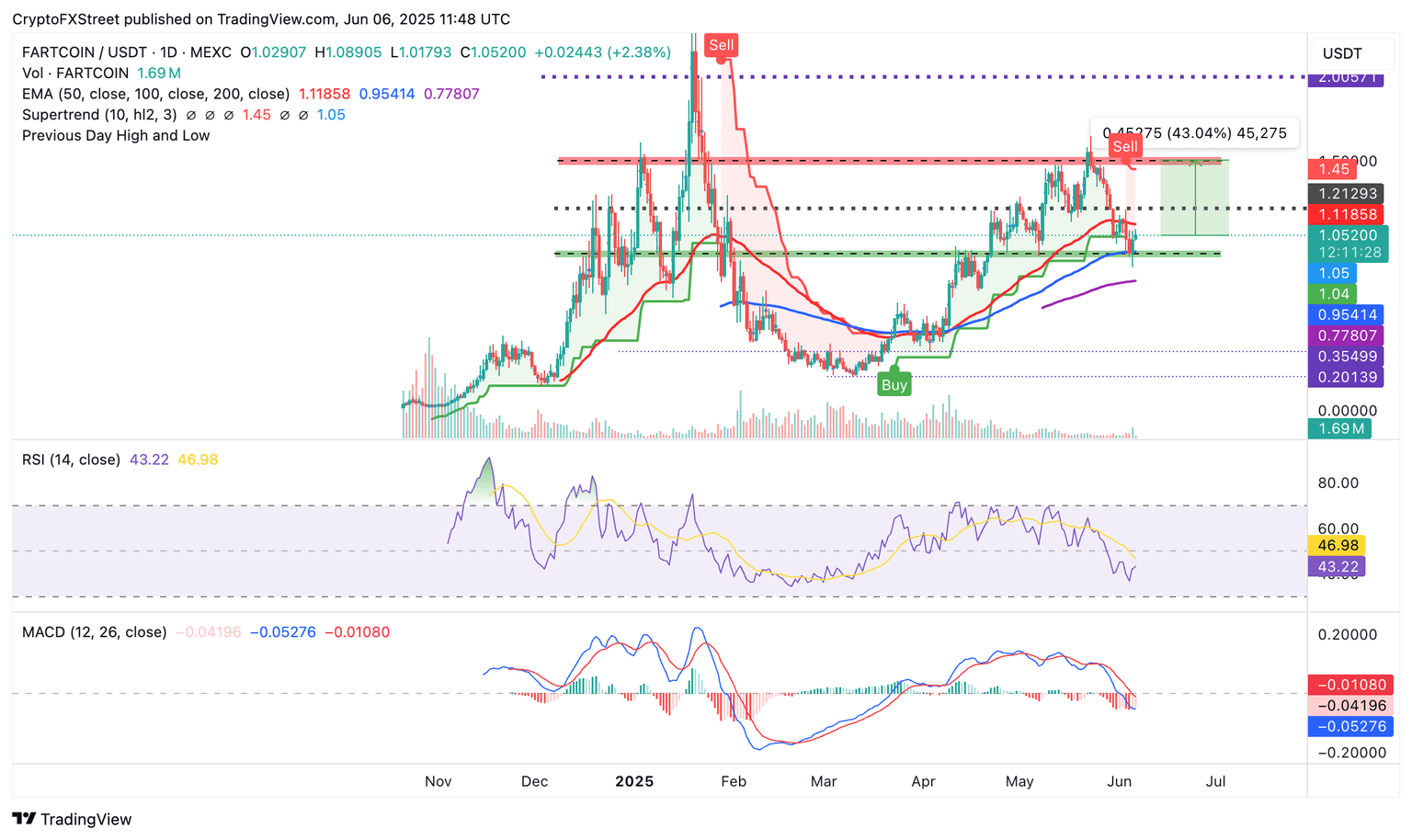 Fartcoin's price hovers above $1.00 support at the time of writing, up 22% from the recent downturn to $0.86. The meme coin currently holds above the 100-day Exponential Moving Average (EMA) at approximately $0.95, and the 200-day EMA is located further down at $0.77.