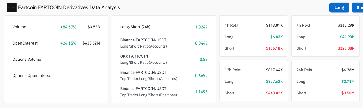 A 24% increase in the derivatives market Open Interest (OI) to $633 million, along with a massive 85% surge in trading volume to $3.52 billion, shows that trader interest in Fartcoin and market participation are rising in tandem.