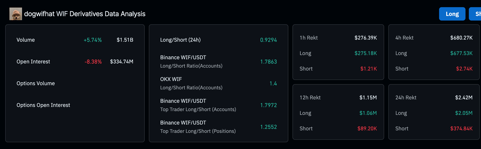 The downtrend that has been sustained since WIF peaked at $1.39 in May has resulted in frequent massive liquidations, with approximately $2 million lost in long positions over the last 24 hours and roughly $375,000 in short positions.