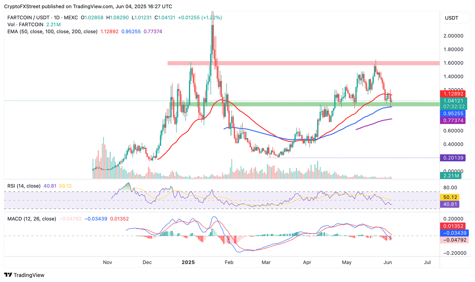 Fartcoin sits above the $1.00 level, a robust support level tested twice in May, and by extension, the 100-day Exponential Moving Average (EMA) at around $0.95.