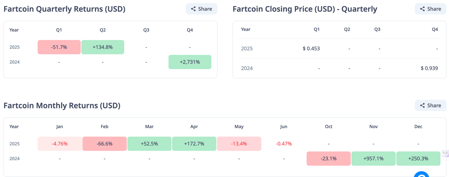 Fartcoin is expected to post its first positive quarterly returns at the end of June, following negative returns in the first quarter (Q1). According to CryptoRank’s analytics data, Fartcoin’s second-quarter (Q2) returns stand at 132.5% compared to -51% seen in Q1.