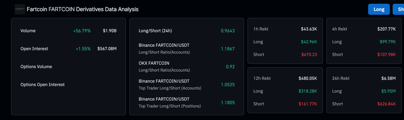 On the other hand, the rising volume in the derivatives market, while long position liquidations surge to $5.95 million over the past 24 hours, points to declining trader interest in Fartcoin.