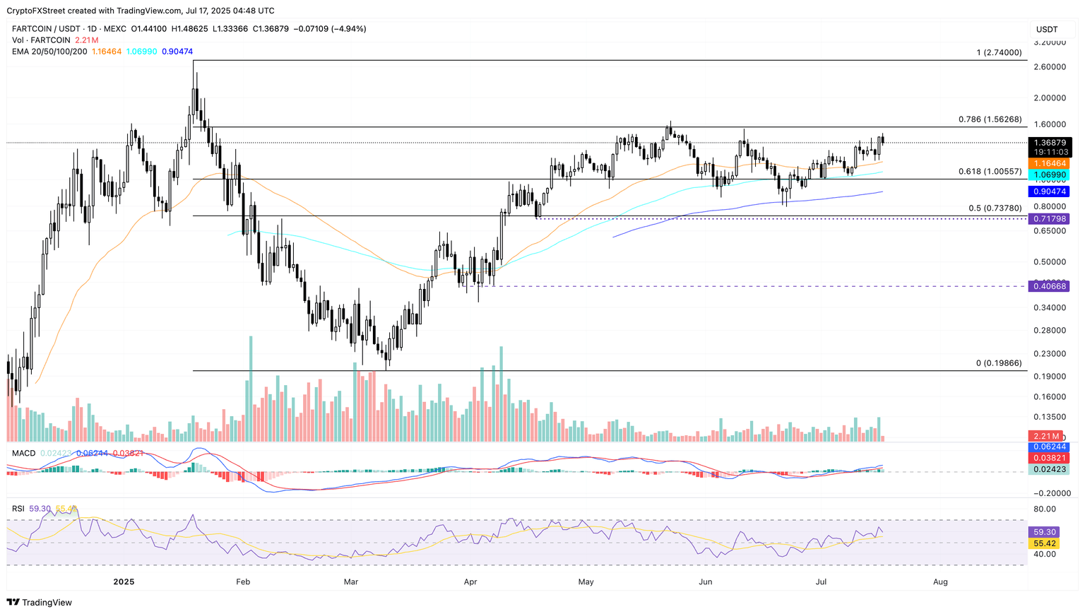 Fartcoin nears the 78.6% Fibonacci retracement level at $1.56, drawn from the $2.74 peak of January 19 to the low of $0.19 from March 10. A potential daily close above this level could extend the bullish run to the $2.00 round figure.