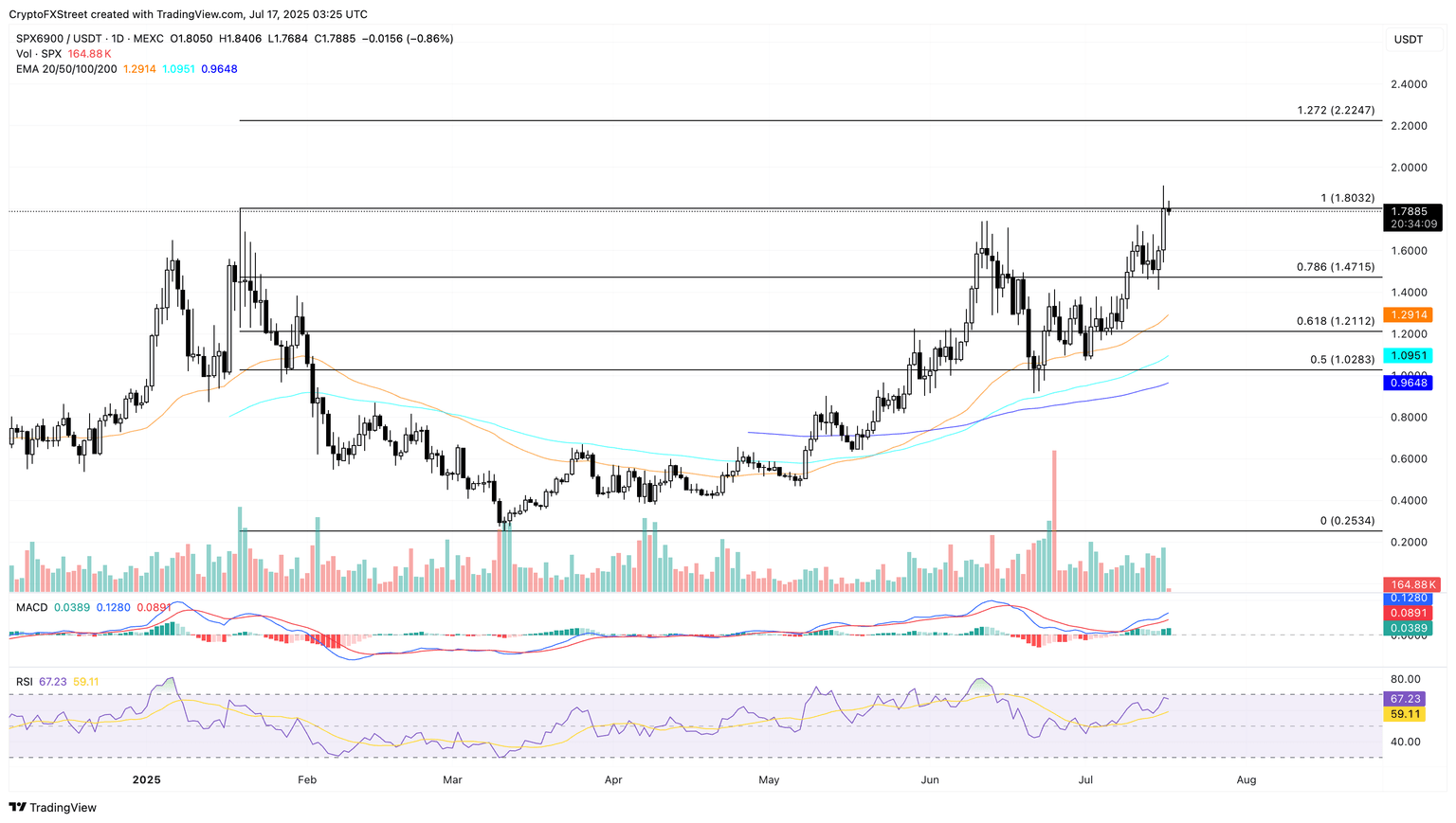 SPX edges lower by nearly 1% so far on Thursday after reaching a new all-time high of $1.91 with a 12% jump on Wednesday. The meme coin struggles to manage a daily close above the $1.80 level, aligning with the previous all-time high.