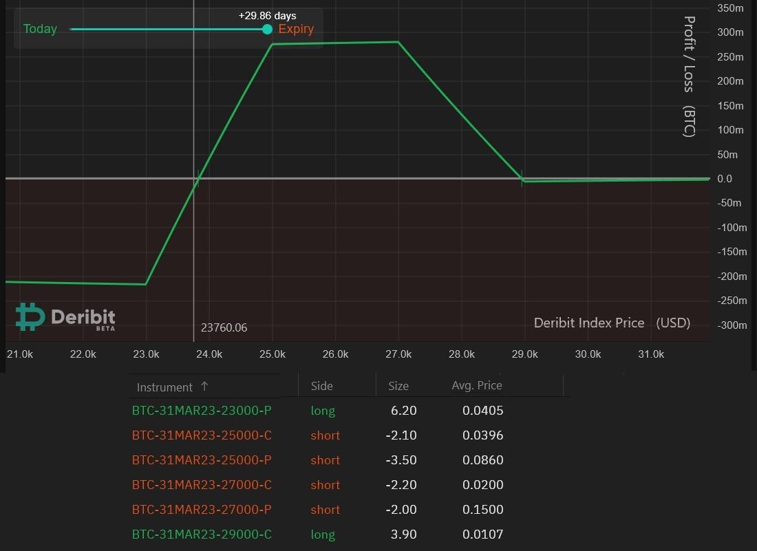 This strategy yields a gain if Bitcoin trades between $23,800 and $29,000 on March 31. Net profits peak at 0.276 BTC ($6,558 at current prices) between $25,000 and $27,000, but remain above 0.135 BTC ($3,297 at current prices) if Bitcoin trades in the $24,400 and $27,950 range.