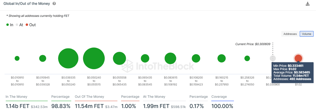 IntoTheBlock’s “ Global In/Out of the Money” (GIOM) model reveals there is no immediate supply barrier that could limit Fetch.ai price from achieving its upside potential. Based on this on-chain metric, there is only one major area of interest between extending from $0.3334 to $1.0200 that is filled by a some investors who had previously bought FET around the $0.5834 price level. Here, approximately 492 addresses are holding nearly 11.54 million FET tokens.